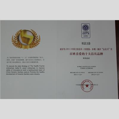 獎 項:2011年中國廚衛百強 衛浴領軍企業10強