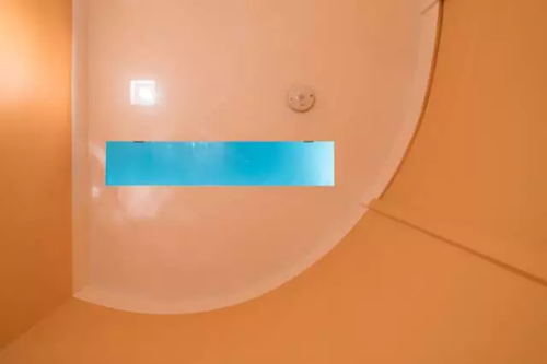 由于客衛(wèi)四面都不臨窗,考慮到這塊區(qū)域的通風(fēng)和采光,設(shè)計(jì)師在這一空間的頂部,開(kāi)了一個(gè)長(zhǎng)方形的氣窗。