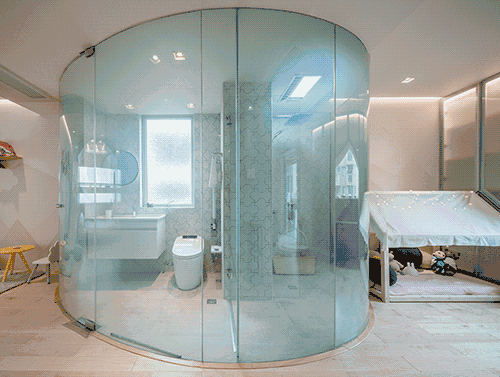 考慮到主衛(wèi)生間的窗戶,是整個(gè)房子西面唯一的自然采光,設(shè)計(jì)師把通電霧化玻璃作為主衛(wèi)生間的墻體材料。從外觀上看,整個(gè)主衛(wèi)生間充滿了現(xiàn)代感和科技感,從實(shí)用角度來(lái)看,衛(wèi)生間白天無(wú)人使用時(shí)可以保證房間的通亮,洗澡時(shí)則可以保證住戶的隱私。