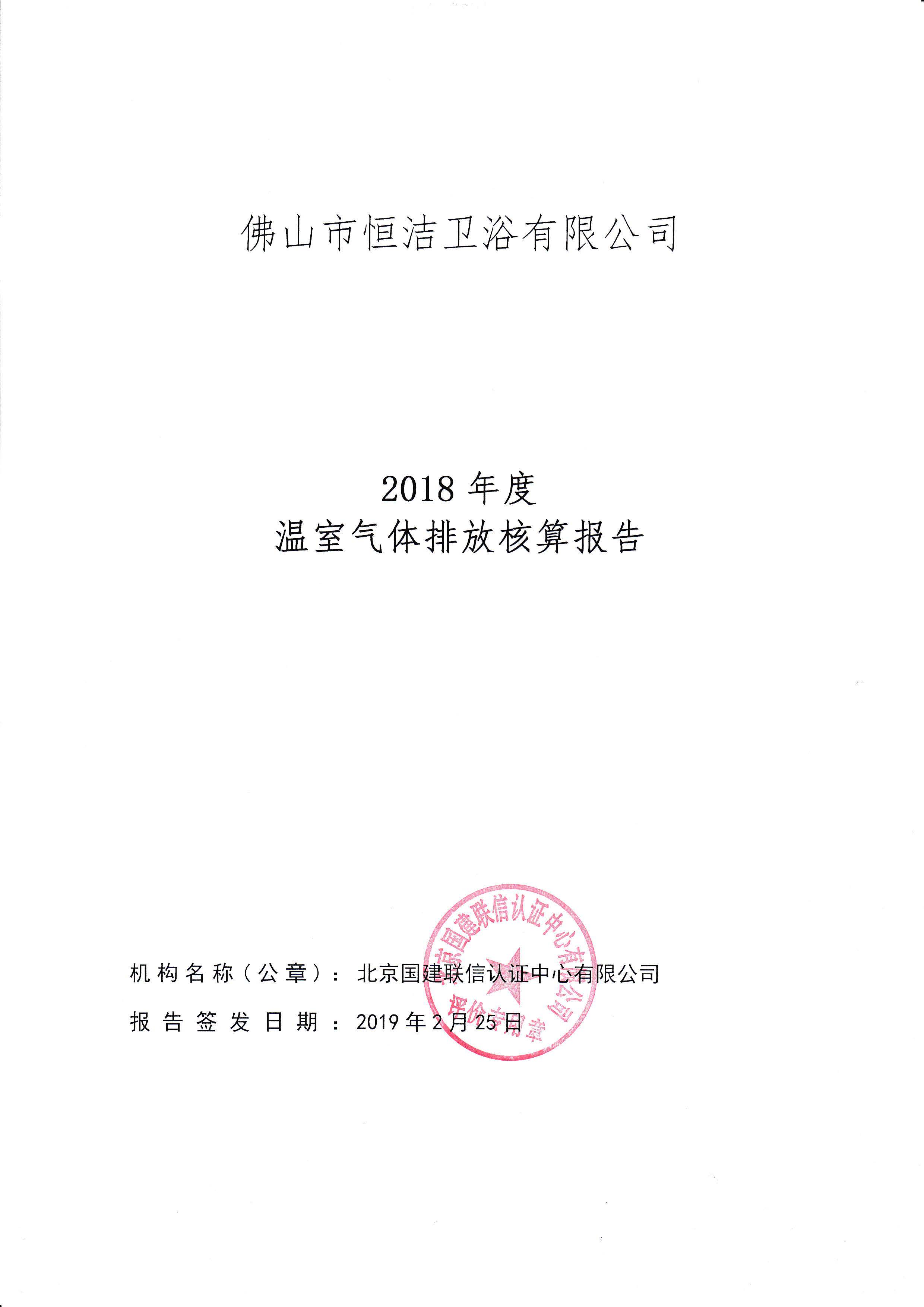 2020年3月24日,受佛山市恒潔衛浴有限公司(以下簡稱“恒潔衛浴”或“我公司”)委托,北京國建聯信認證中心有限公司對我公司進行了碳核查工作,并于4月10日出具了《佛山市恒潔衛浴有限公司2019年度溫室氣體排放核查報告》。