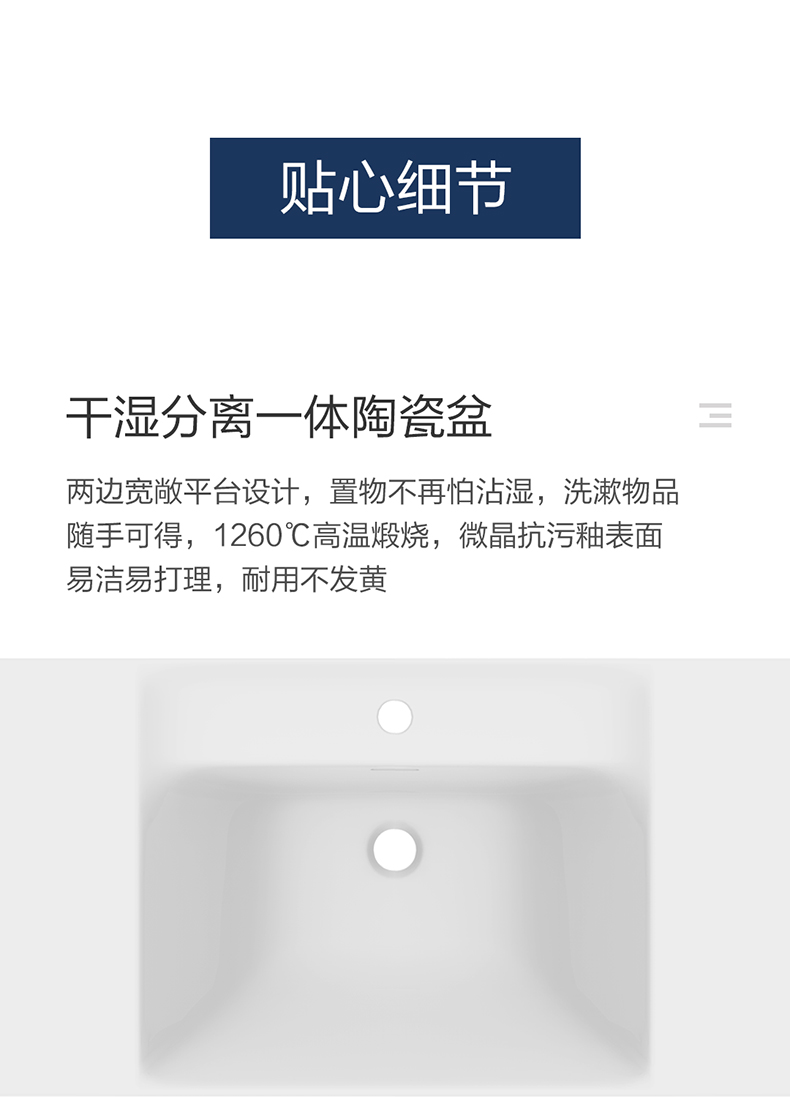 微晶易潔高溫陶瓷盆:干濕分離一體陶瓷盆,置物不怕沾濕;兩邊寬敞平臺設計,洗漱物品隨手可得